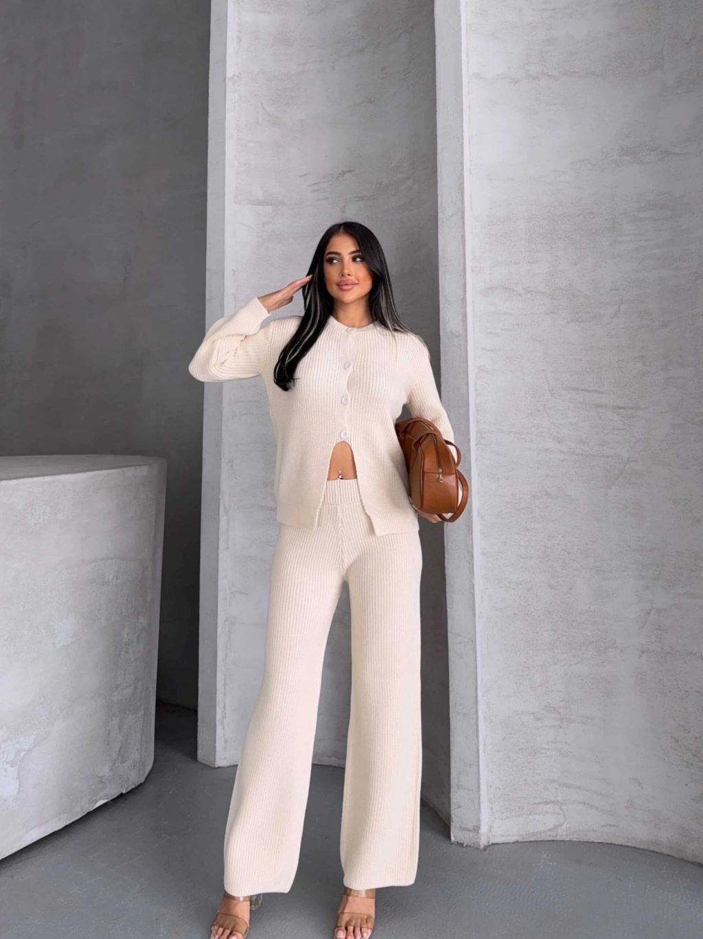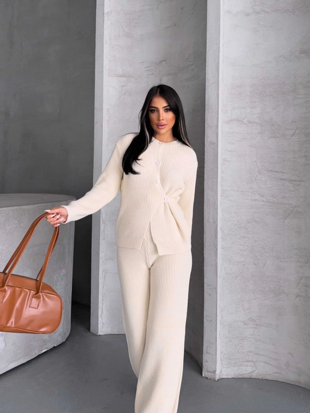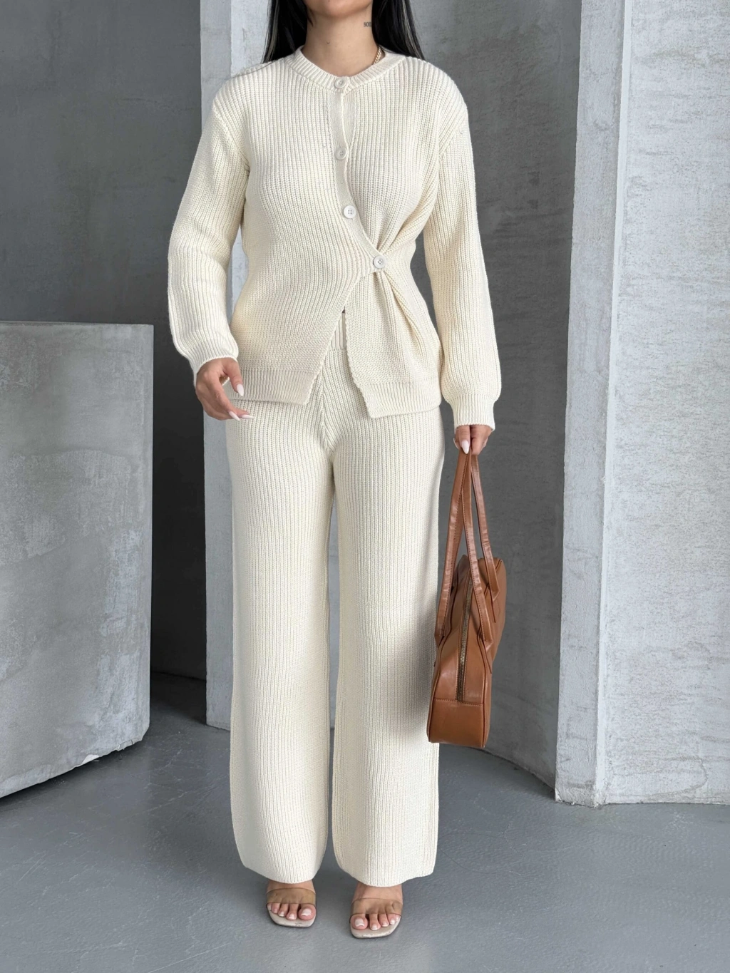 Düğme Detay Triko Takım 1565 - Kemik