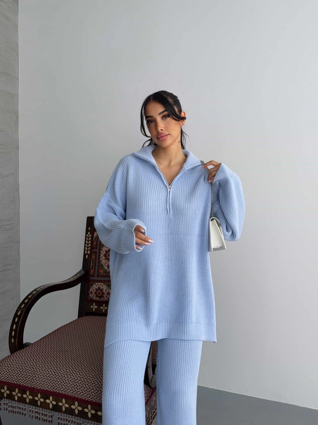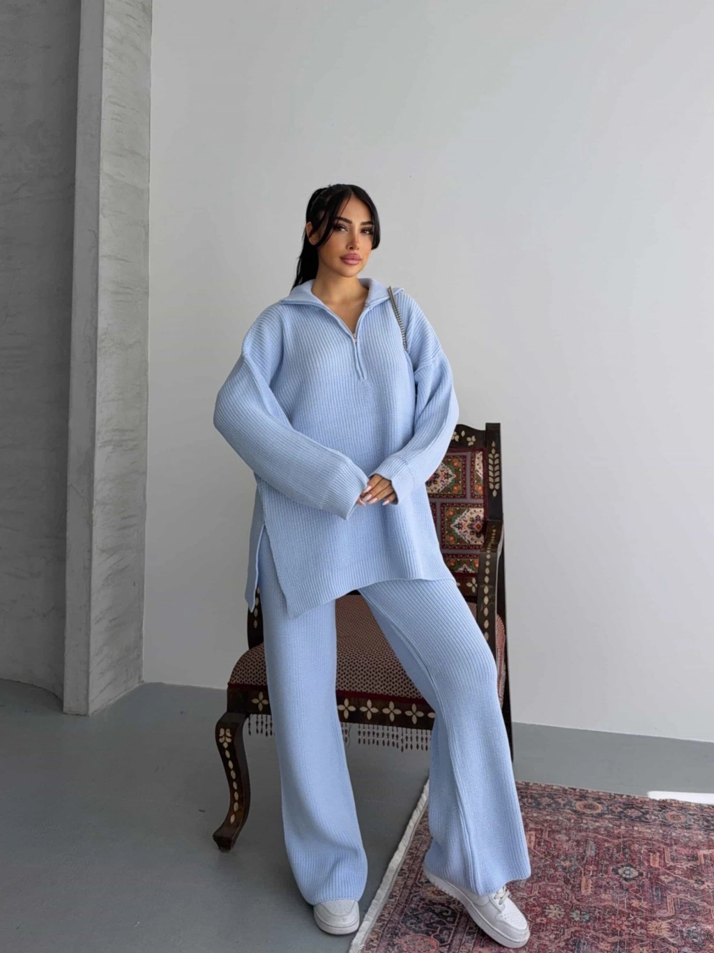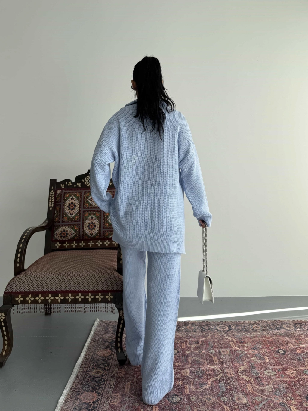 Ürün İçeriği: %30 Yün %70 Akrilik Model Bedeni: (S/M Beden) Eu:36-38 Us:4-6 Ürün Ölçüleri:Üst Kazak:Boy: 75 cm - En: 63 cm - Omuz: 55 cm - Kol Boyu: 43 cmAlt PantolonBel: 26 cm - Basen: 50 cm - Boy: 102 cm