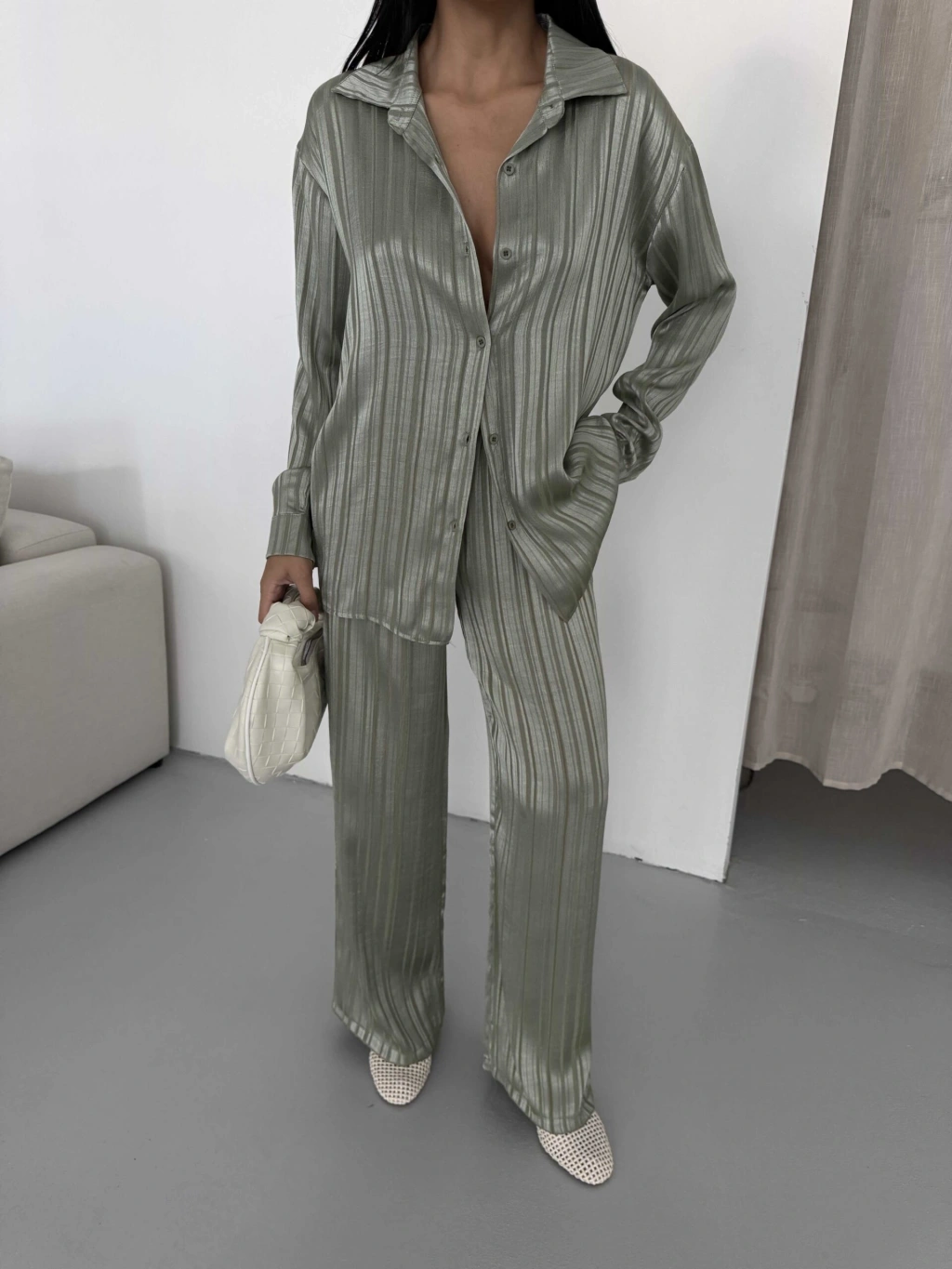 Çizgi Desen Saten Takım - Yeşil