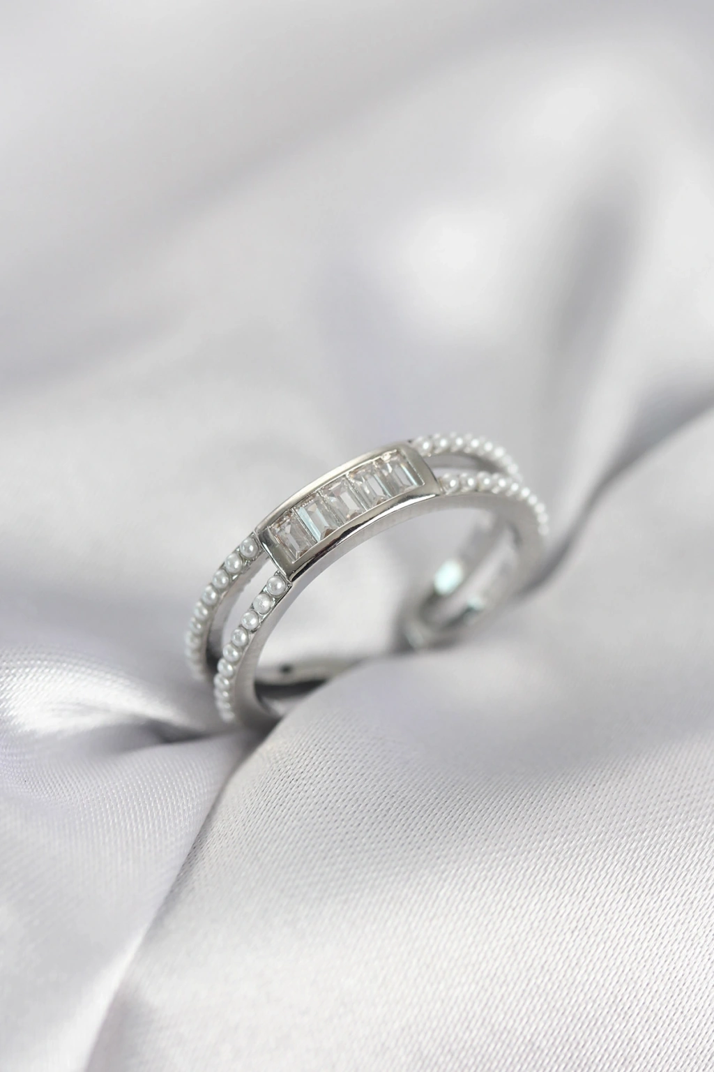 MuI MuI Silberfarbener Damenring mit Baguette-Zirkonia und Perlen