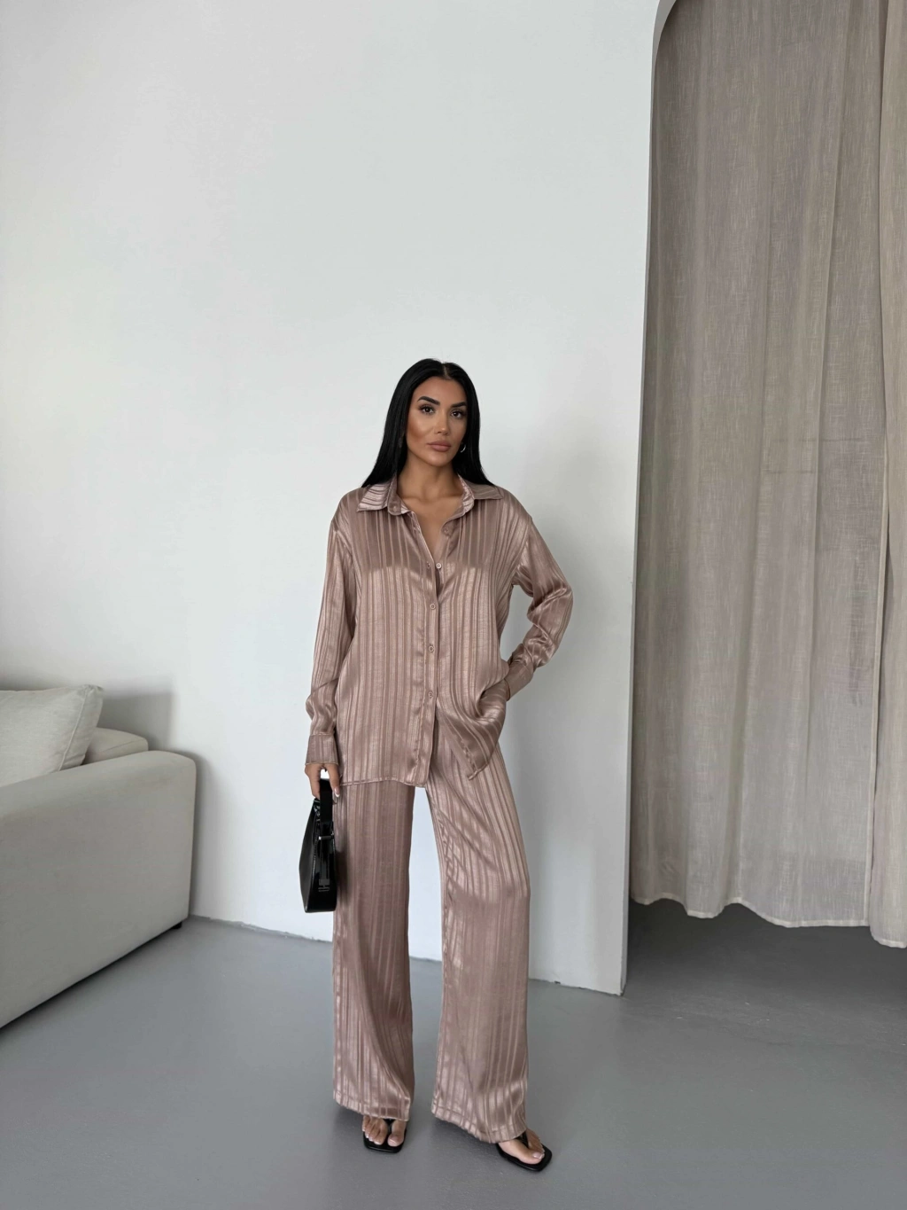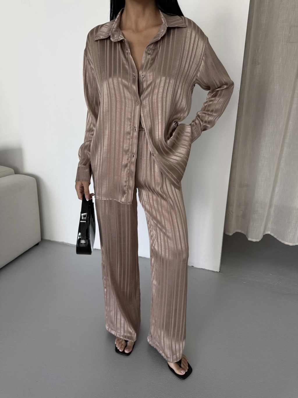 Çizgi Desen Saten Takım 2519 - Kahverengi