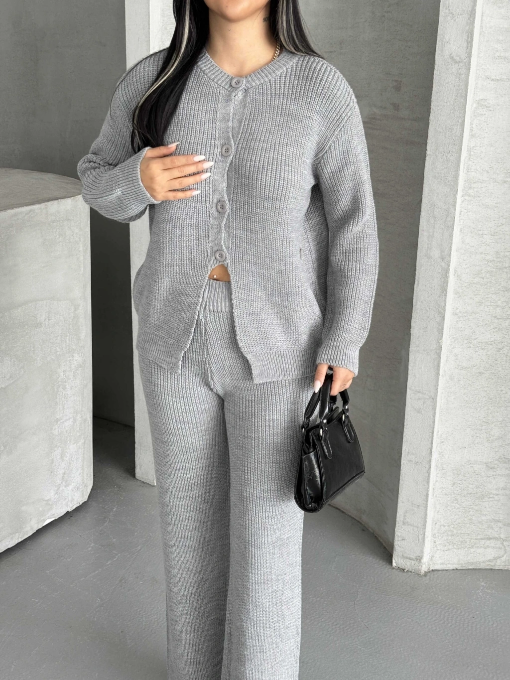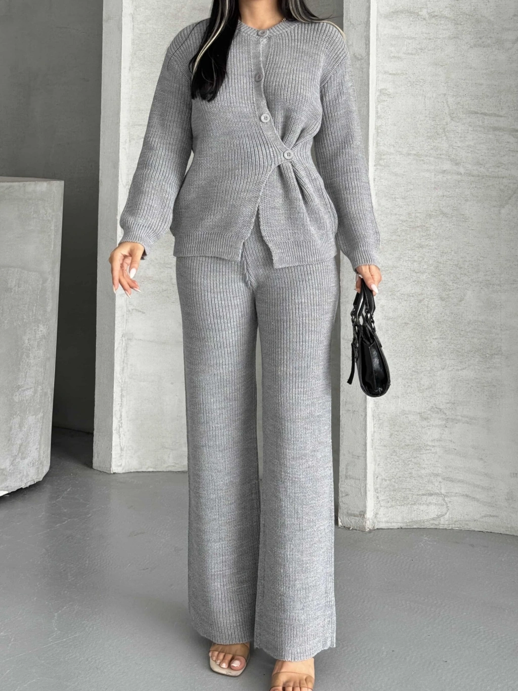 Düğme Detay Triko Takım 1565 - Gri