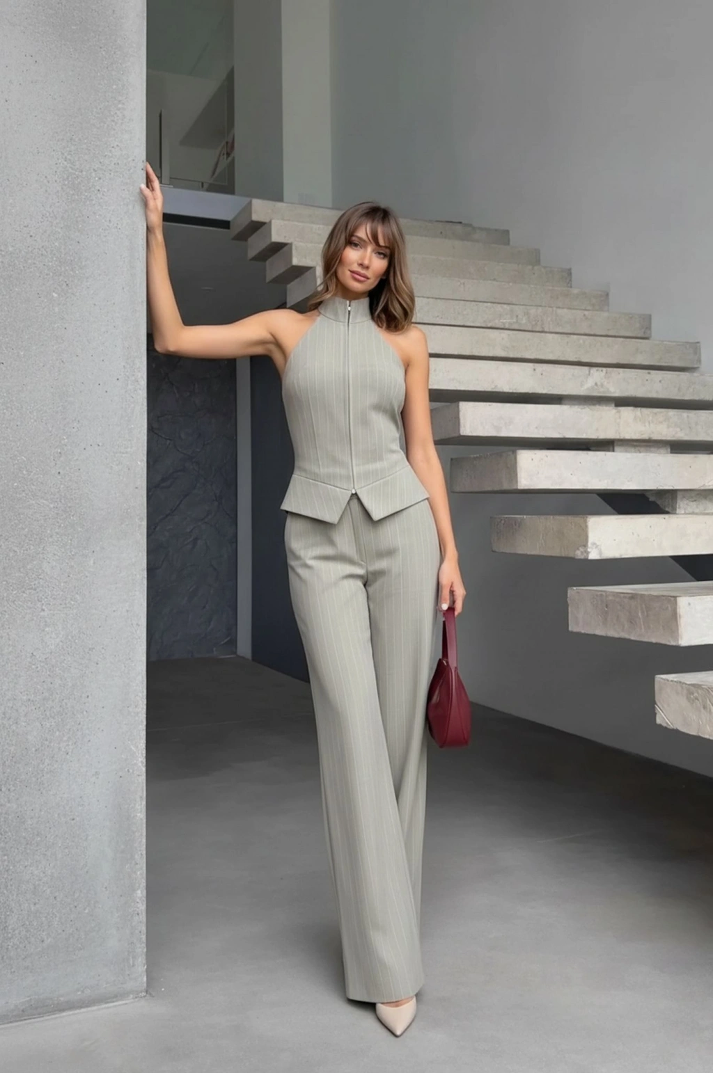 Fermuar Detay Kolsuz Çizgili Takım - Gri