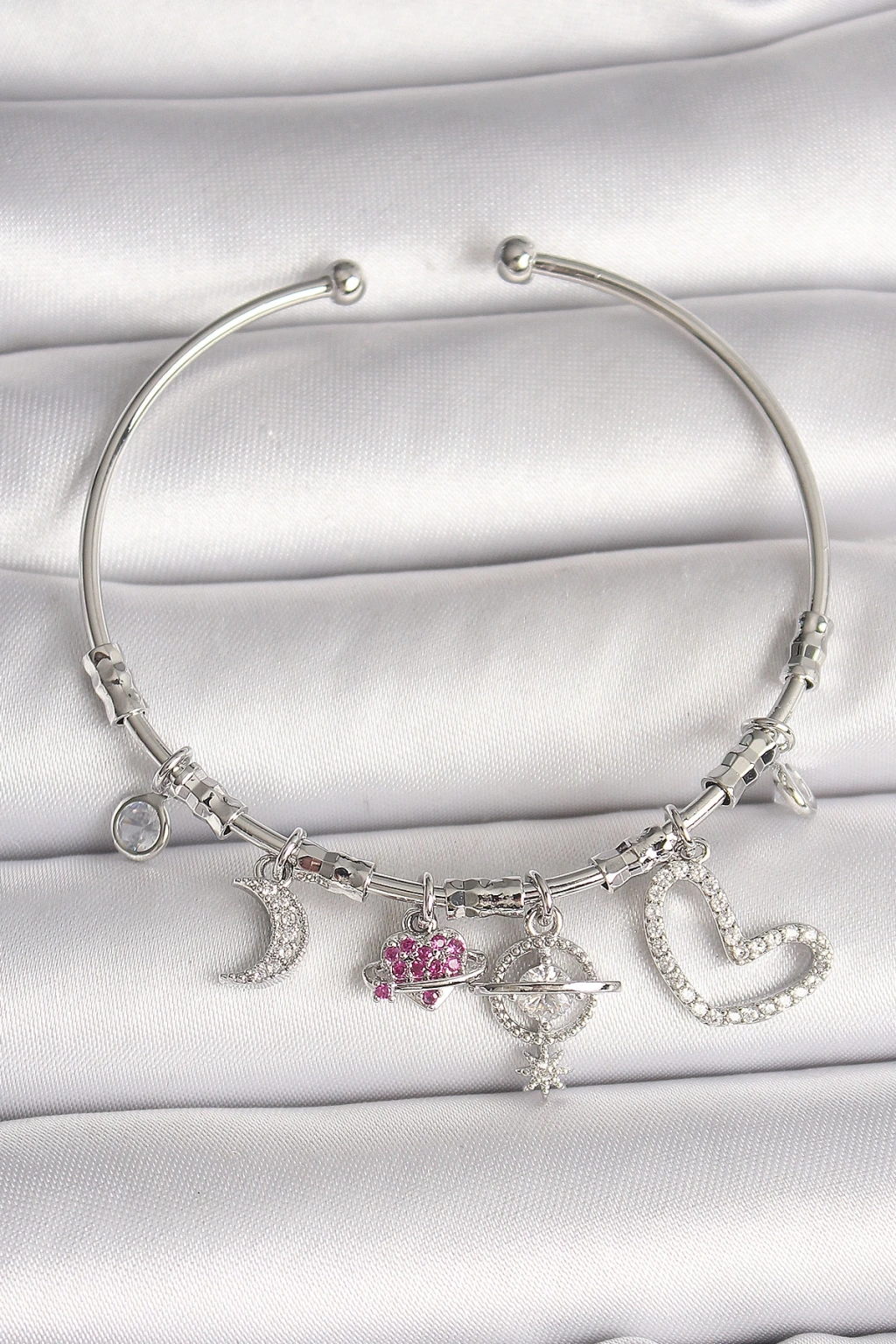 MuI MuI Pirinç Gümüş Renk Sallantı Zirkon Taşlı Gezegen Figür Kalp Detay Charm Kadın Bileklik