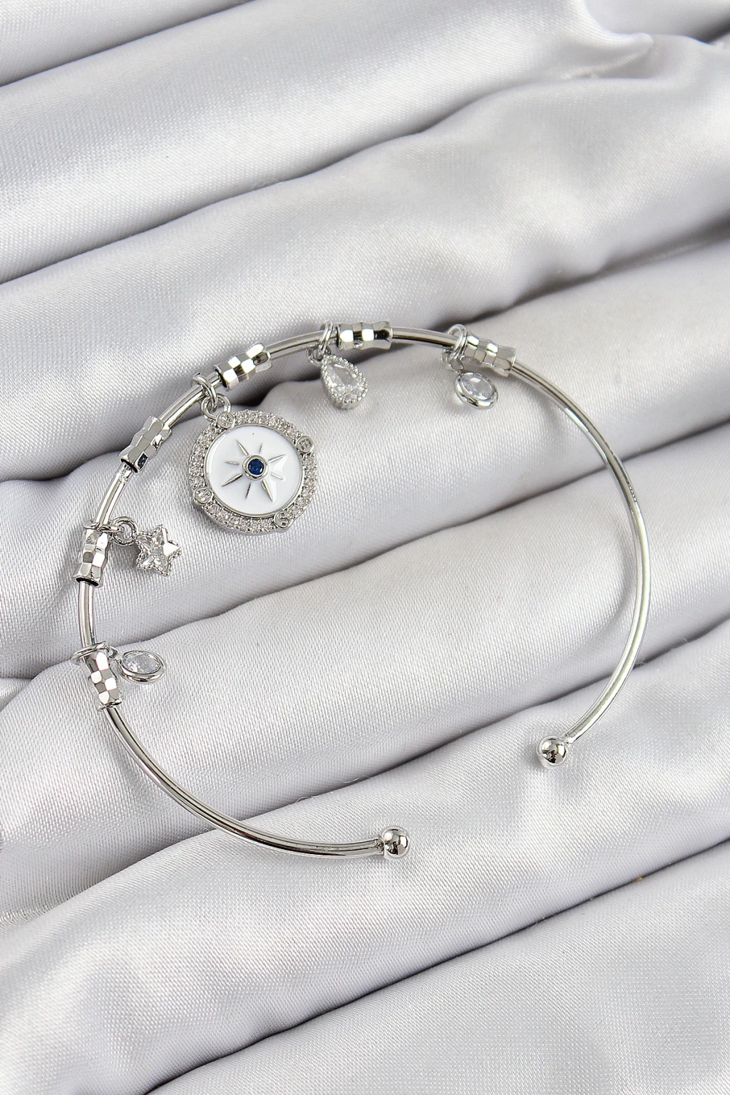 MuI MuI Pirinç Zirkon Taşlı Pusula Model Gümüş Renk Charm Bileklik