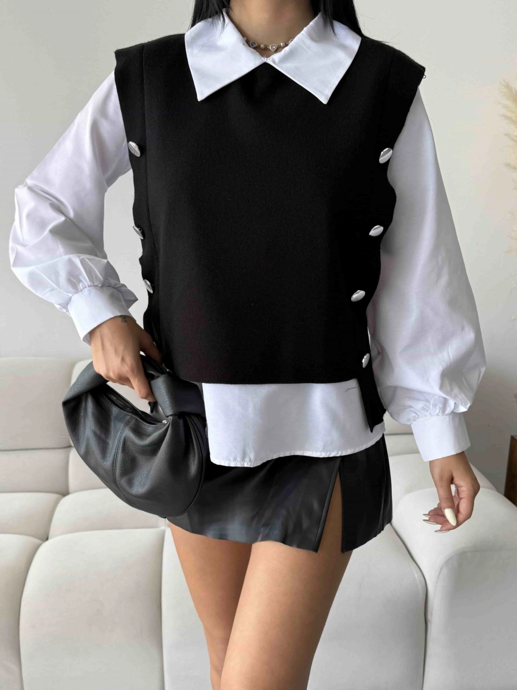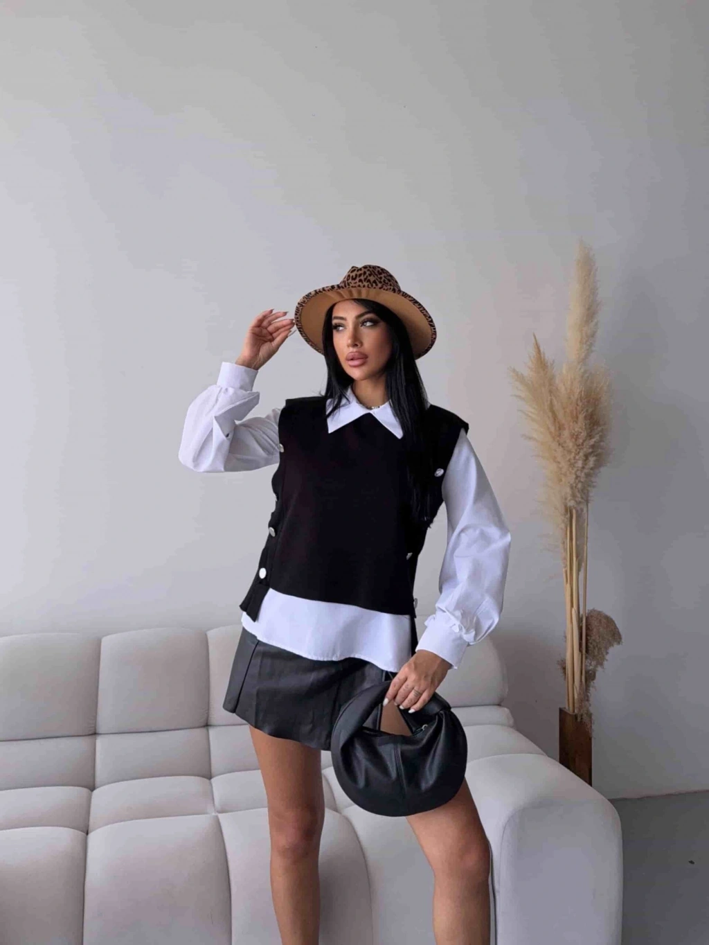 Ürün İçeriği: Gömlek (%95 Cotton % 5 Polyester) Süveter ( %30 Wool %70 Acrylic) Model Bedeni: (S Beden) Eu:36 Us:4 Ürün Ölçüleri: Boy: 62 cm - En: 48 cm - Kol Boyu: 55 cm
