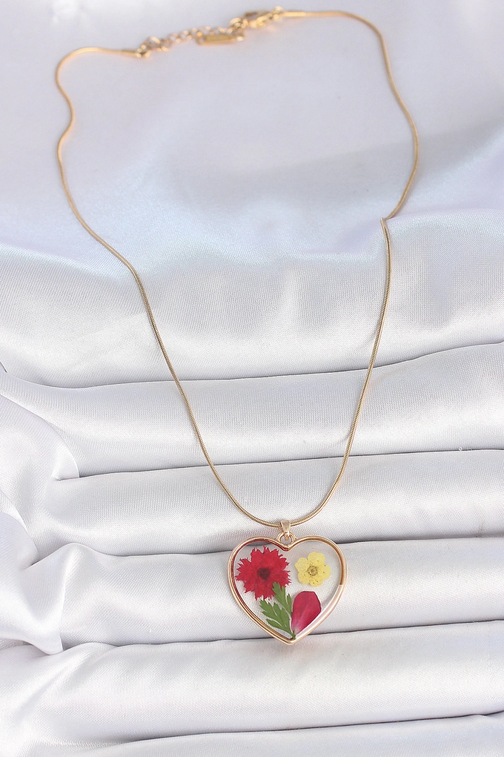 MuI MuI 316L Çelik Gold Renk Zincir Epokis Kalp Doğal Çiçek Model Kadın Kolye