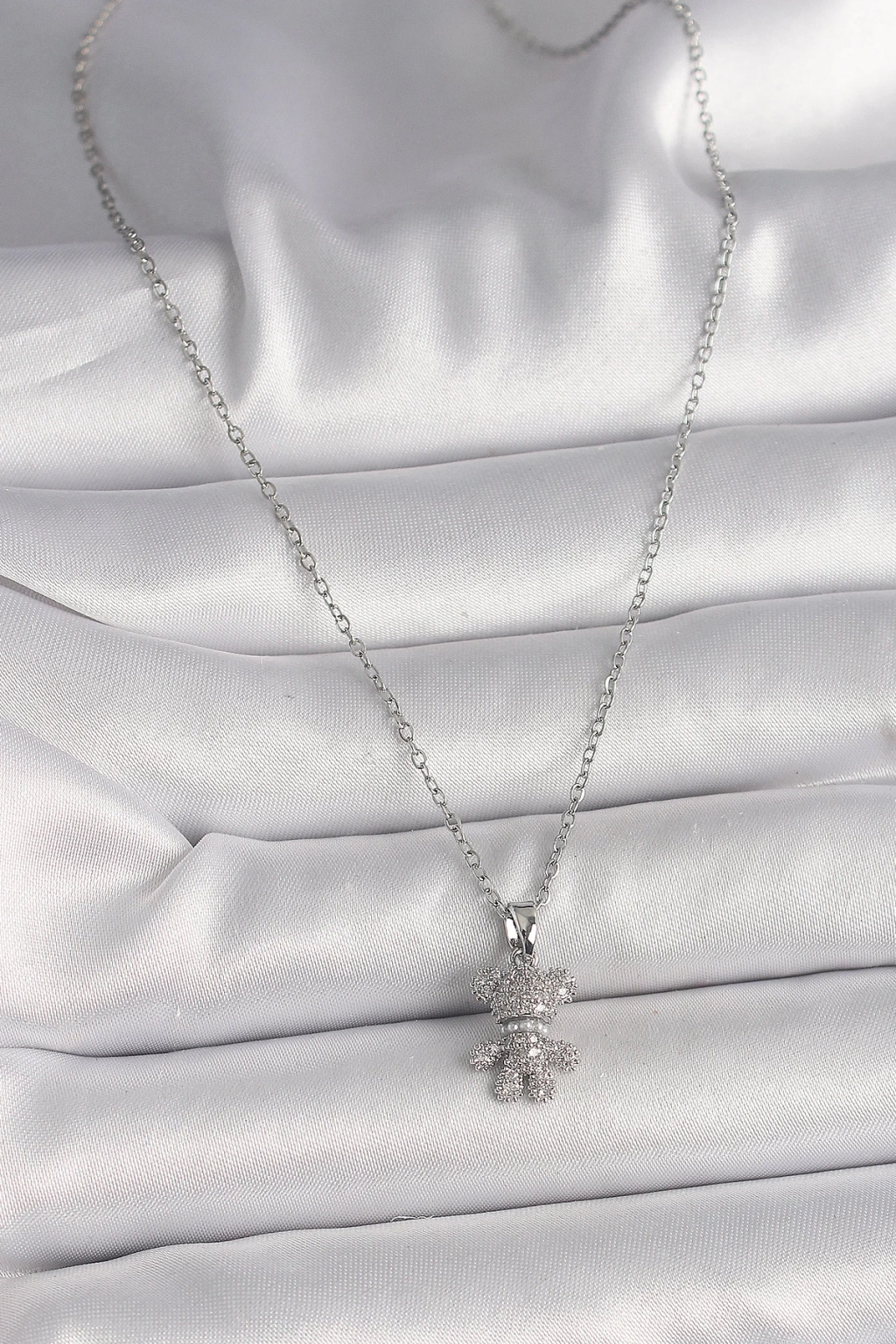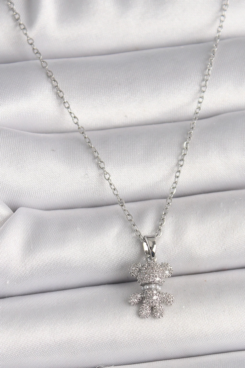 MuI MuI 316L Çelik Gümüş Renk Zincir Zirkon Taşlı Ayıcık Figür Kadın Kolye