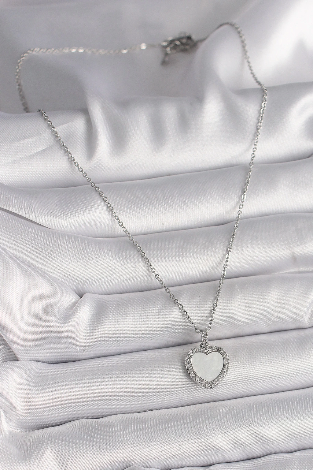 MuI MuI 316L Çelik Gümüş Renk Zincir Zirkon Taşlı Beyaz Mineli Kalp Model Kadın Kolye