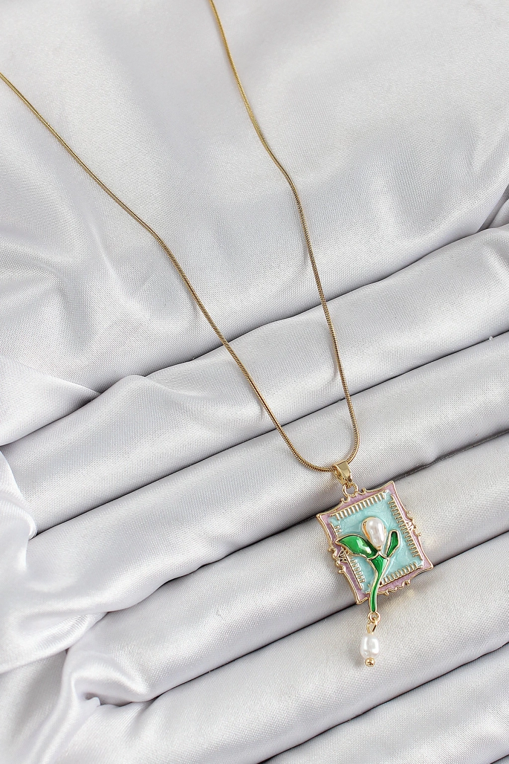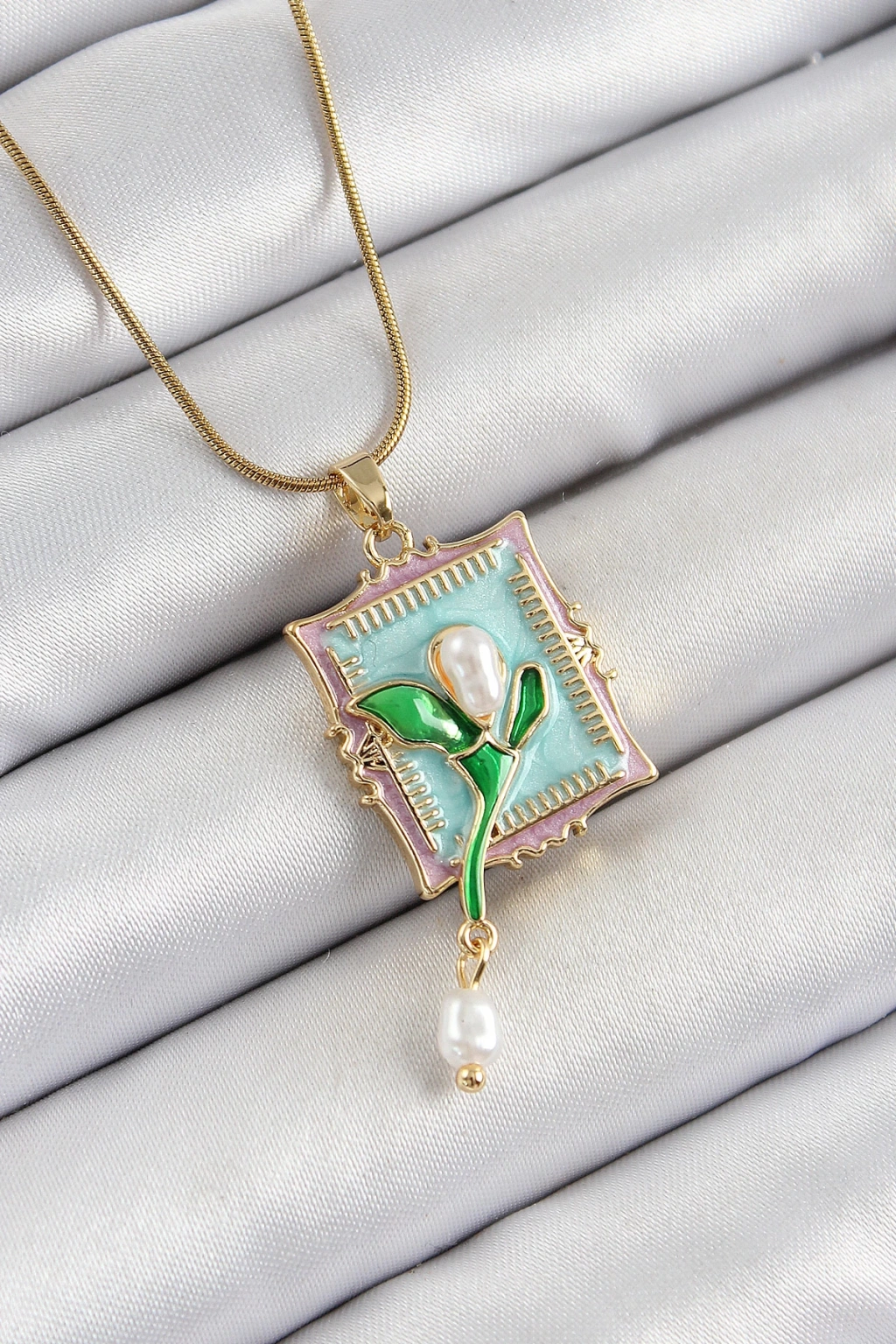 MuI MuI 316L Çelik Zincir Turkuaz Sanatsal Portre Sallantılı İnci Detaylı Lale Model Gold Renk Kadın Kolye