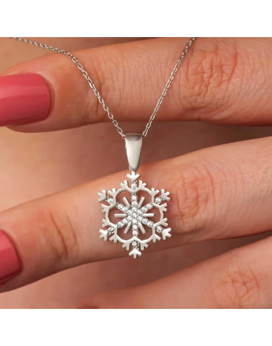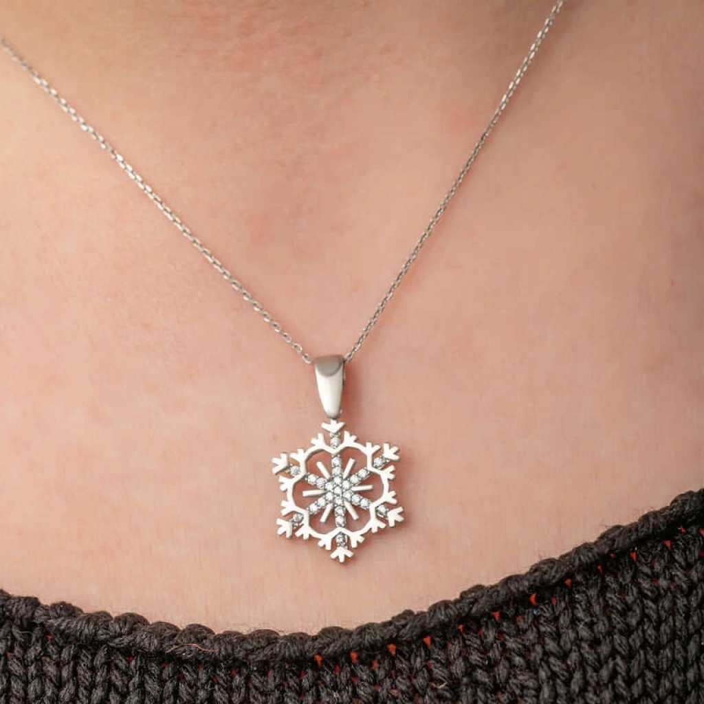 Kadınların ışıltısı, berraklığı kar tanesine benzetilip özel olarak tasarlanmıştır. Kar tanelerinin her birinin kadınlar gibi eşsiz ve ayrı kıymette olması onları özel kılan bir diğer özelliktir. Asilliği her dönemde dikkat çekmeyi başarmıştır. Bunun yanında insanların tıpkı kar taneleri gibi birbirlerine zarar vermeden de mutlu bir şekilde yaşayabileceklerini sembolize etmektedir. Bu şık kolye; doğum günü hediyesi, sevgililer günü hediyesi veya annelere hediye olarak özel günlerde tercih edilebilecek mükemmel bir seçenektir. Kolye, 925 ayar gümüşten imal edilmiştir. Gümüş üzerine rodyum kaplama yapılmıştır. Rodyum kaplama yapılan gümüş kadın kolye modelleri parlaklığını uzun süre muhafaza eder, oksitlenmesi gecikir. Zincir boyu ortalama 45 cm'dir. Tüm gümüş kadın kolye modellerinde olduğu gibi bu gümüş kar tanesi kadın kolye de tamamı el emeği ile üretilmiştir. Gümüş ve değerli taşlar nedeniyle belirtilen ortalama ürün ağırlığında ± %10 sapma olabilmektedir.