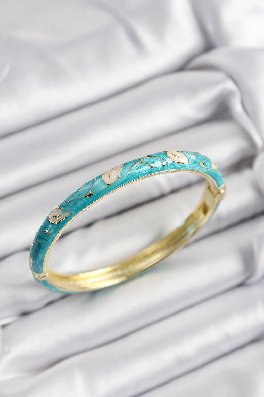 MuI MuI Mineli Pirinç Krem Ve Turkuaz Yaprak Motifli Gold Renk Kadın Kelepçe