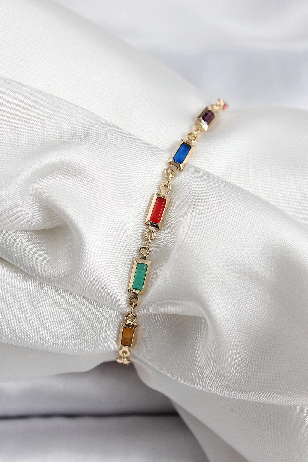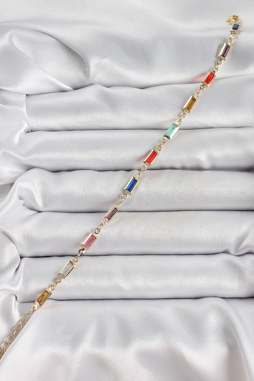 MuI MuI Pirinç Gold Renk Karışık Renkli Kare Zirkon Taşlı Kadın Bileklik