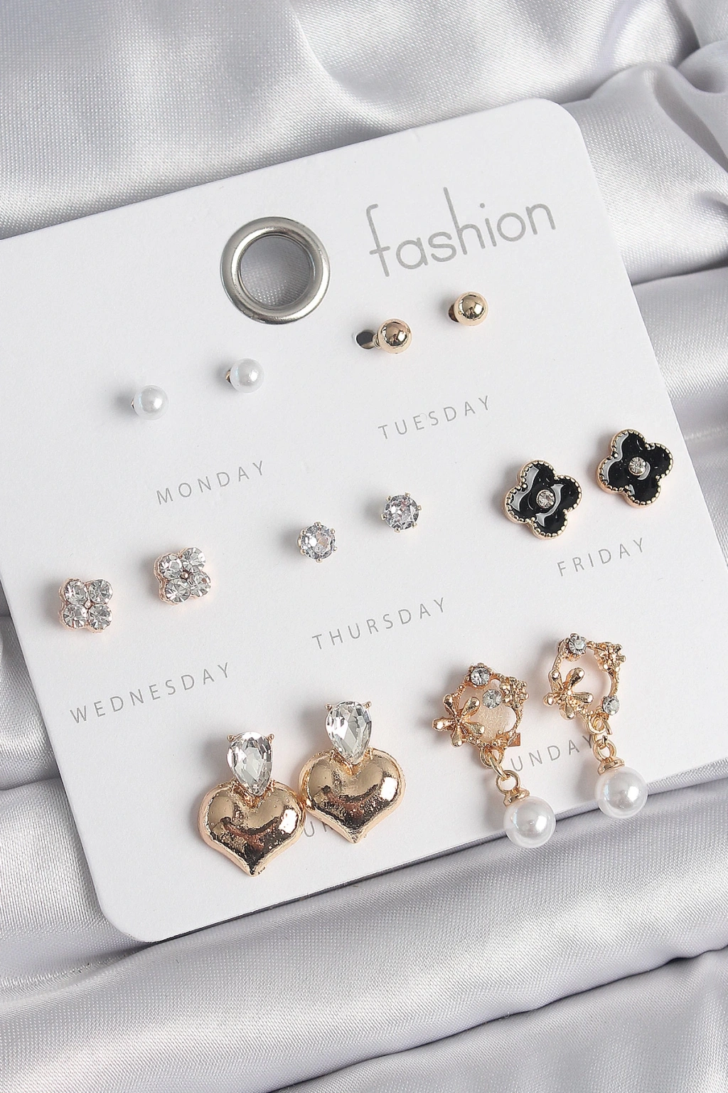 MuI MuI Pirinç Gold Renk Zirkon Taşlı Kalp Figür Siyah Yonca Detay 7 Çift Kadın Küpe Seti