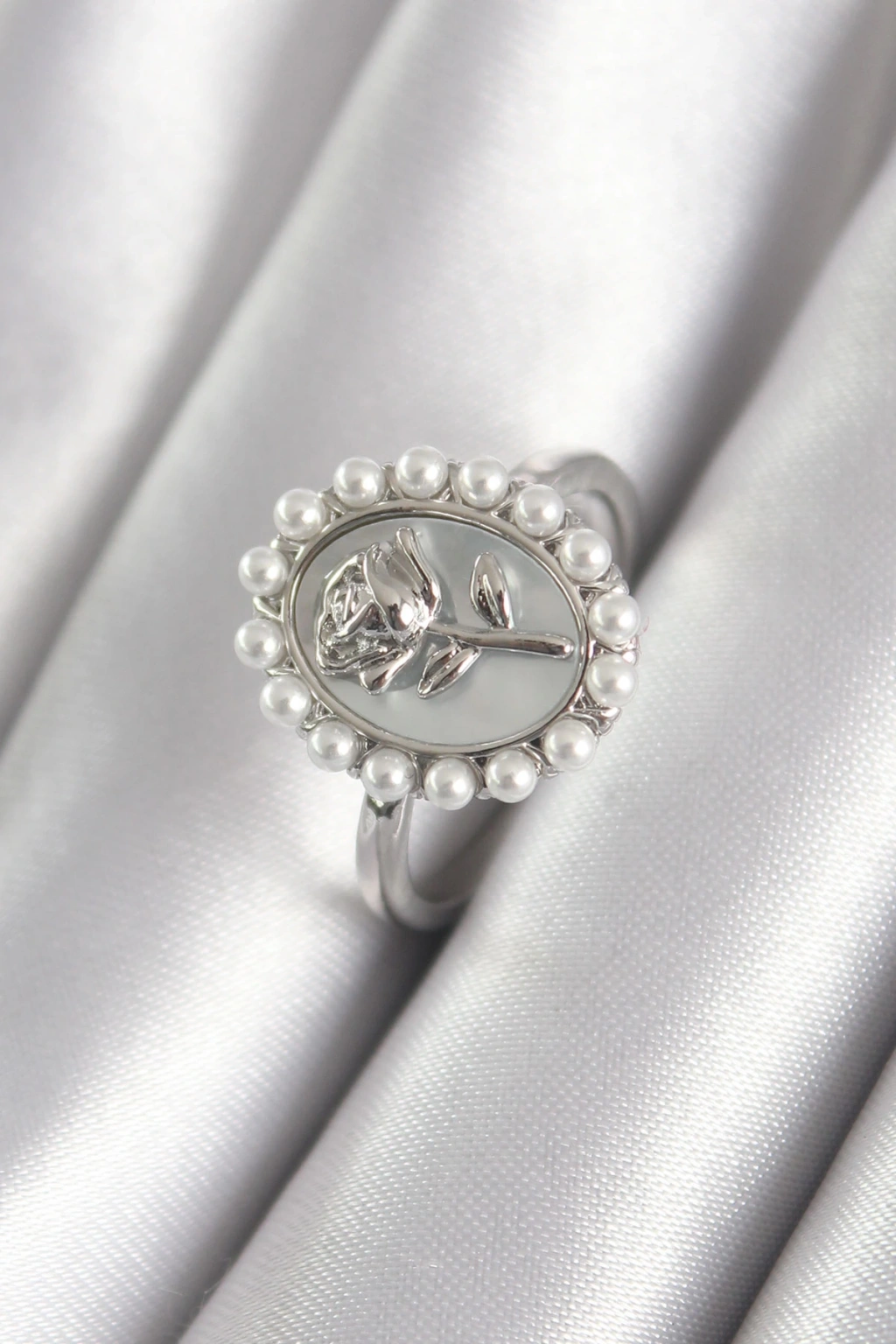 MuI MuI Pirinç Gümüş Renk Portre Gül Model İnci Detay Kadın Yüzük