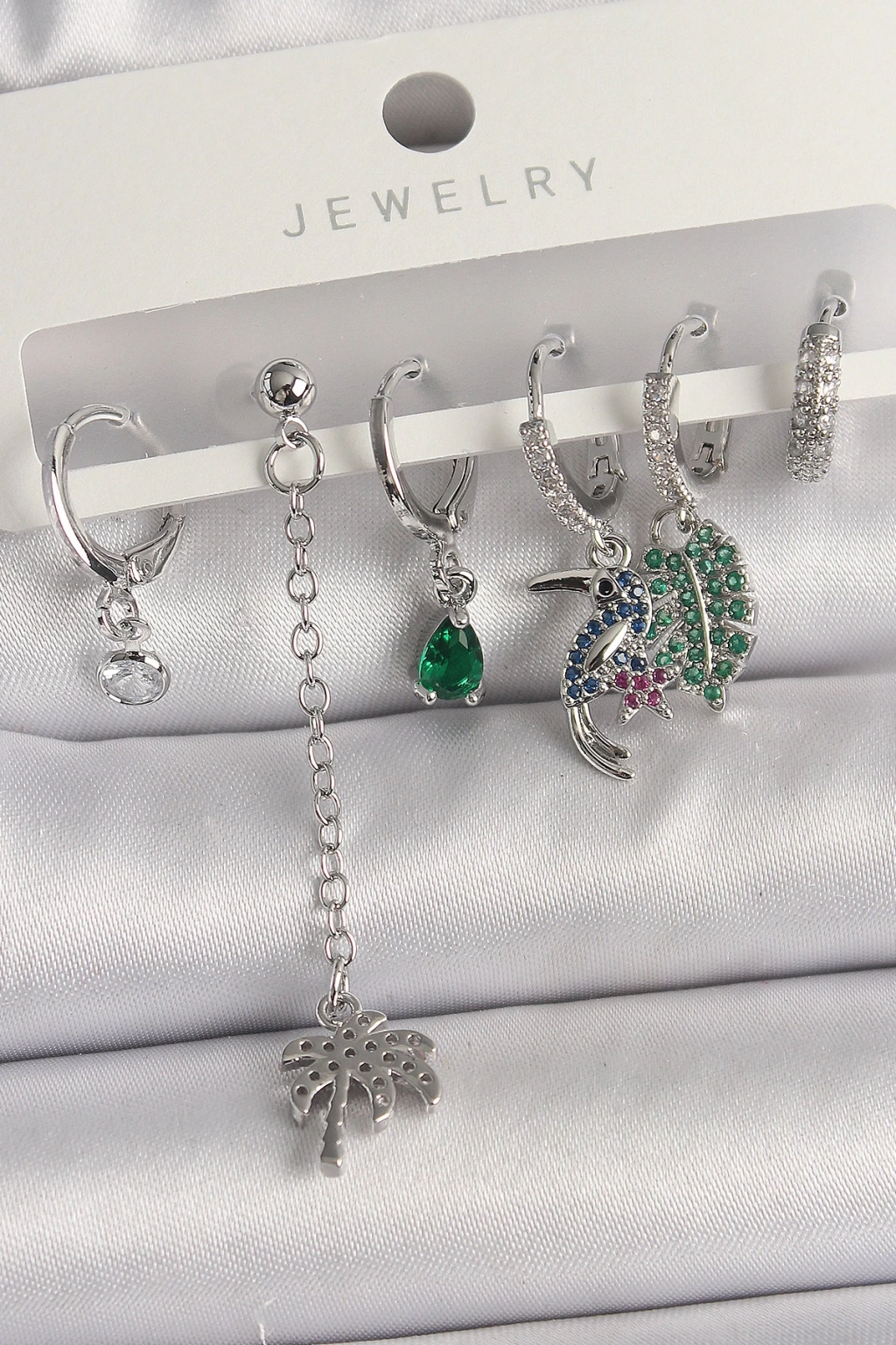 MuI MuI Pirinç Gümüş Renk Sallantı Zirkon Taşlı Ağaç Figür Çoklu Kadın Küpe Seti