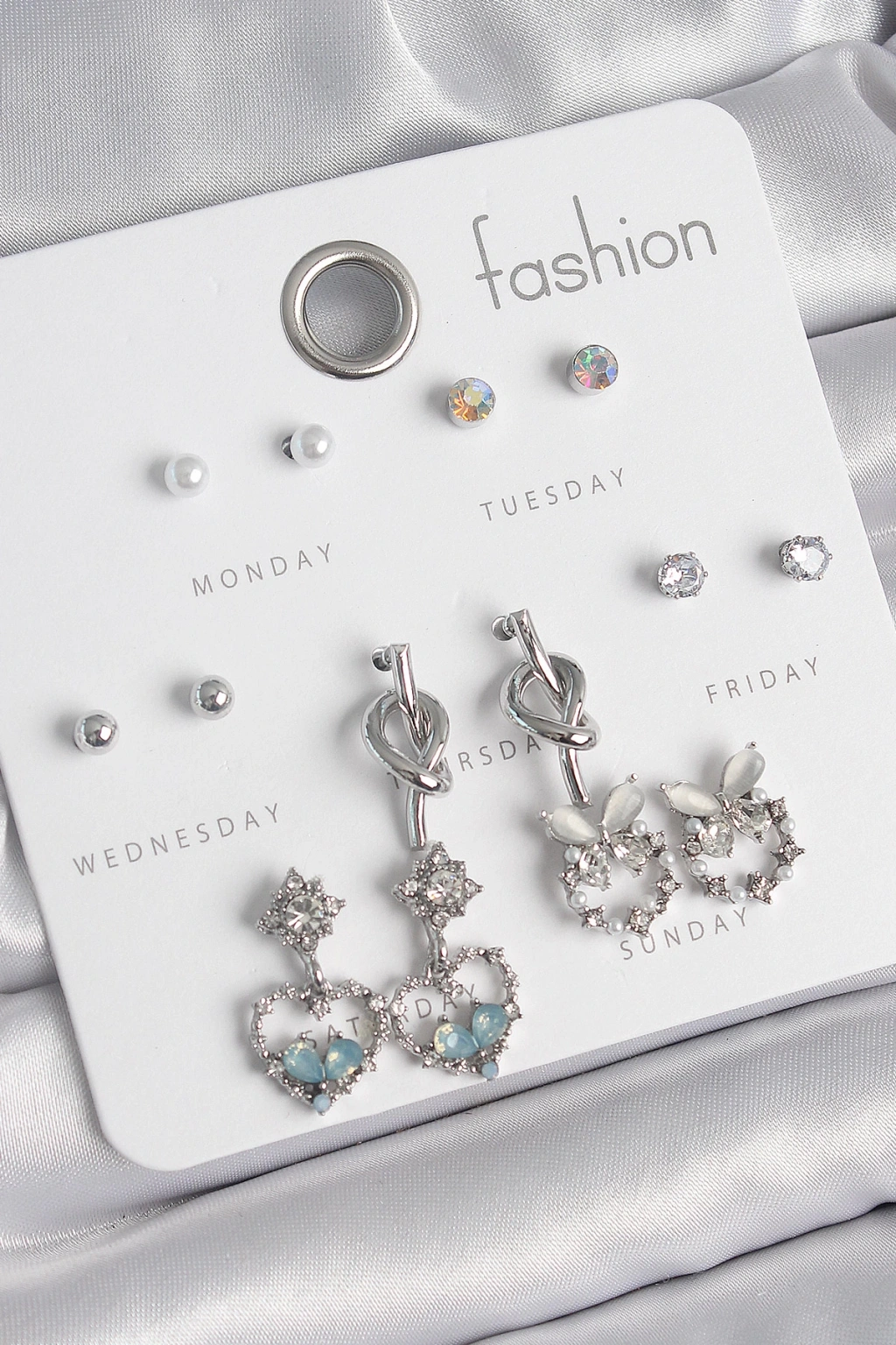 MuI MuI Pirinç Gümüş Renk Sallantı Zirkon Taşlı Kalp Model Düğüm Detay 7 Çift Kadın Küpe Seti