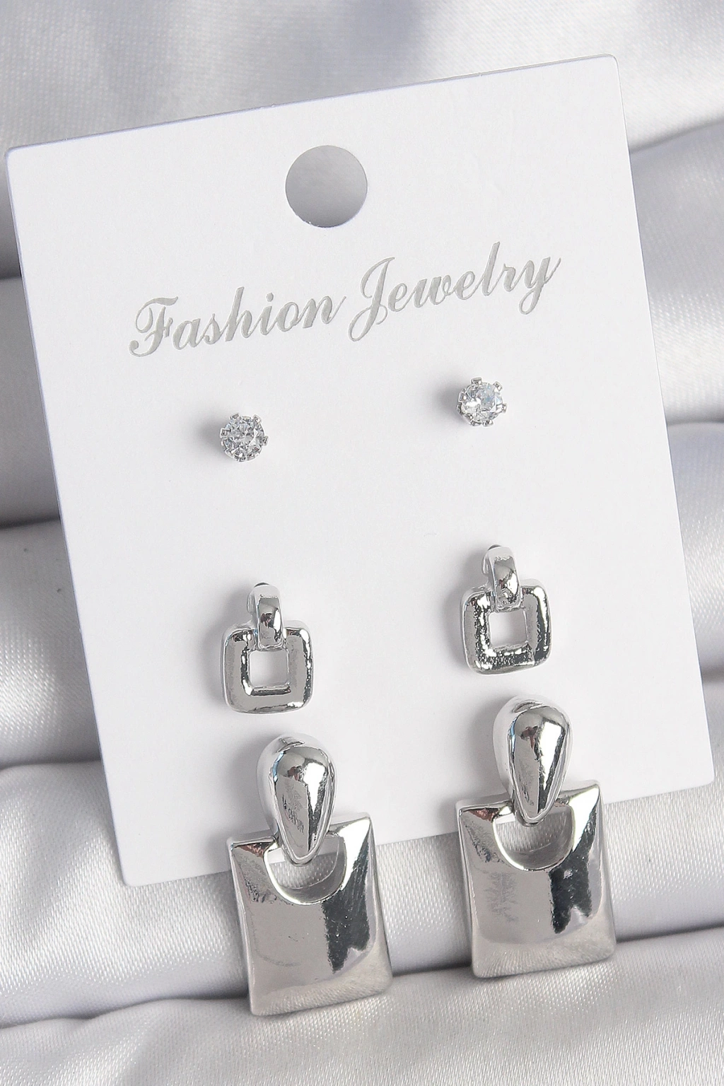 MuI MuI Pirinç Gümüş Renk Zirkon Taş Detay Sallantılı Kare Model 3 Çift Kadın Küpe Seti