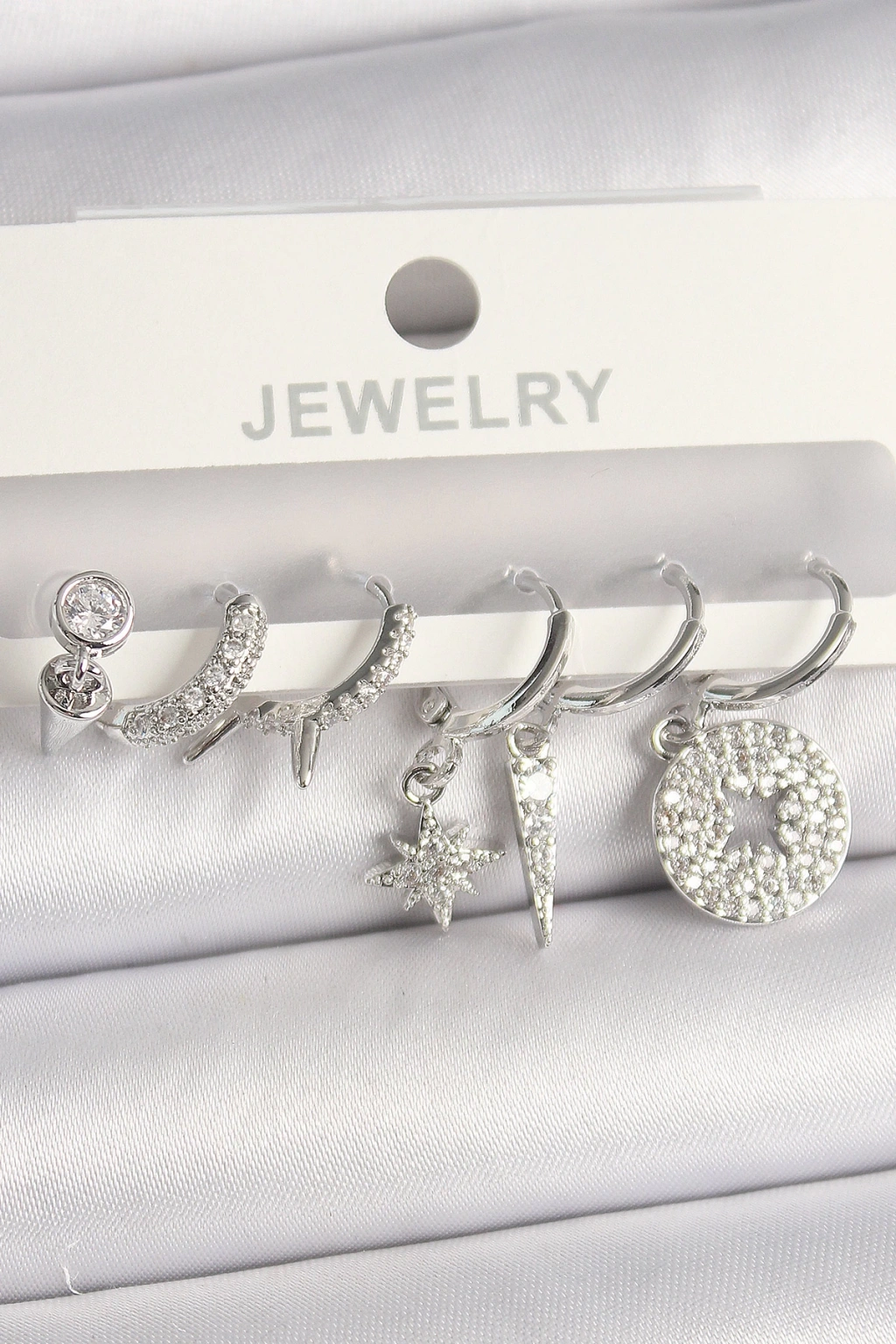 MuI MuI Pirinç Gümüş Renk Zirkon Taşlı Çoklu Figür Kadın Küpe Seti