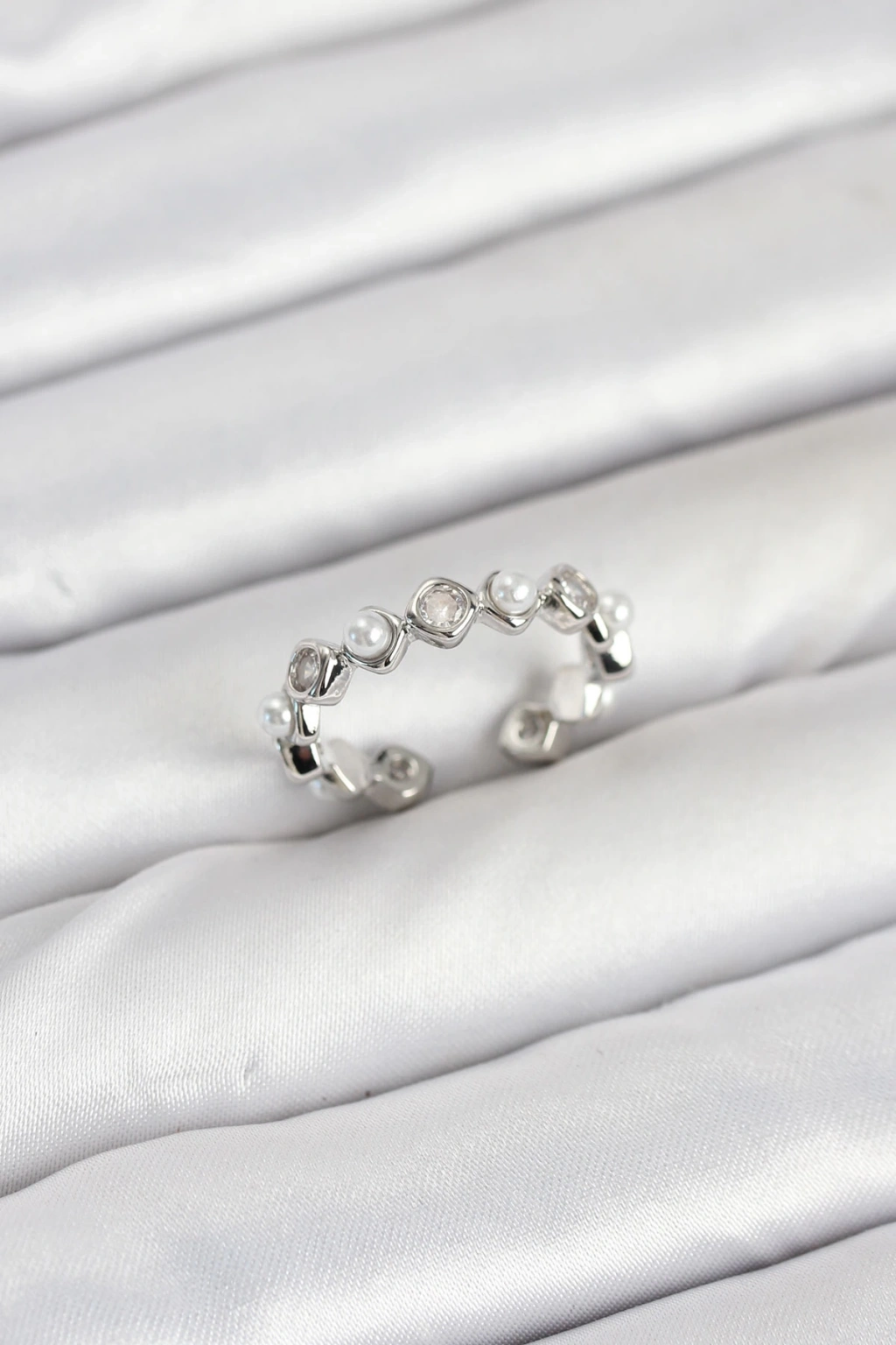 MuI MuI Pirinç Gümüş Renk Zirkon Taşlı İncili Kadın Yüzük