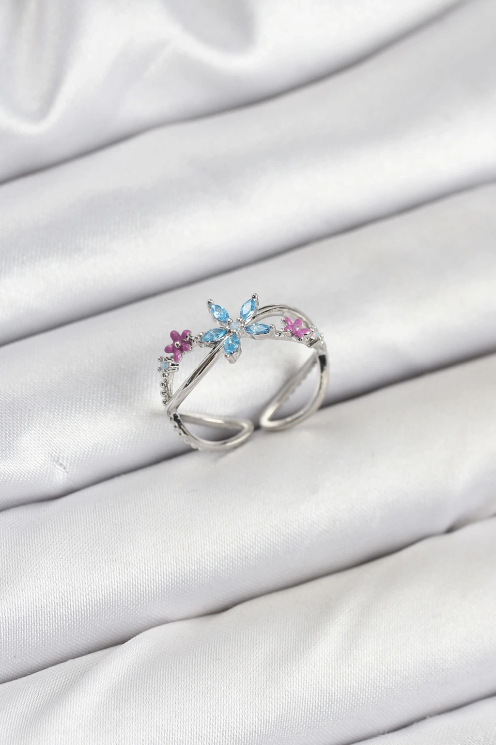 MuI MuI Pirinç Gümüş Renk Zirkon Taşlı Mavi Çiçekli Kadın Yüzük