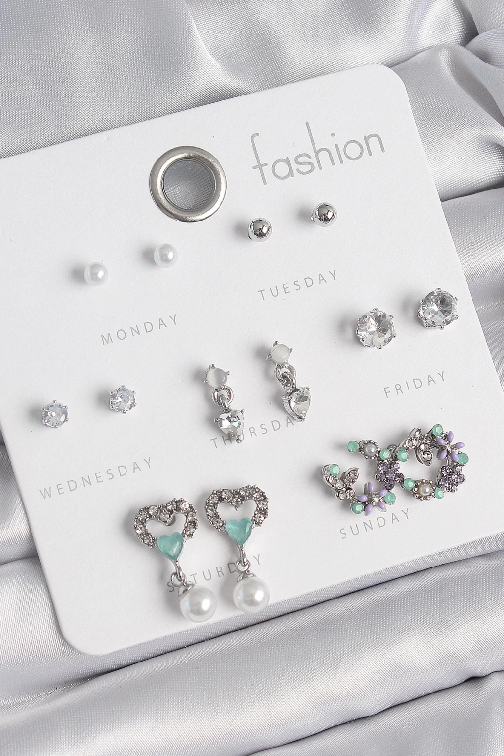 MuI MuI Pirinç Gümüş Renk Zirkon Taşlı Sallantılı Kalp Model Çiçek Detay 7 Çift Kadın Küpe Seti