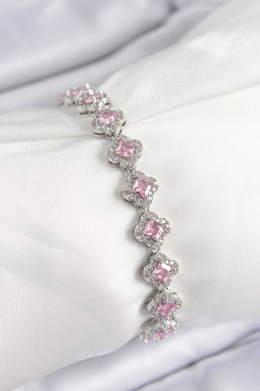 MuI MuI Pirinç Zirkon Taşlı Pembe Yonca Baget Model Gümüş Renk VIP Seri Kadın Bileklik