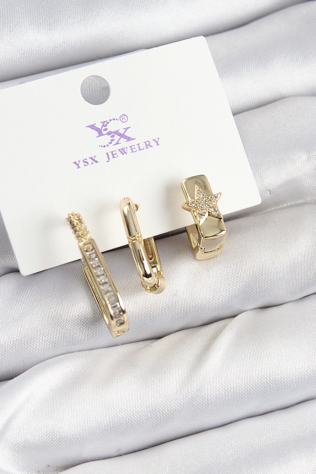 MuI MuI Pirinç Zİrkon Taşlı Yıldız Model Gold Renk 3'lü Kadın Küpe
